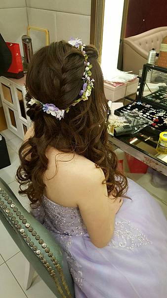 而且她很細心的還用跟禮服一樣的紫色飾品來作造型
